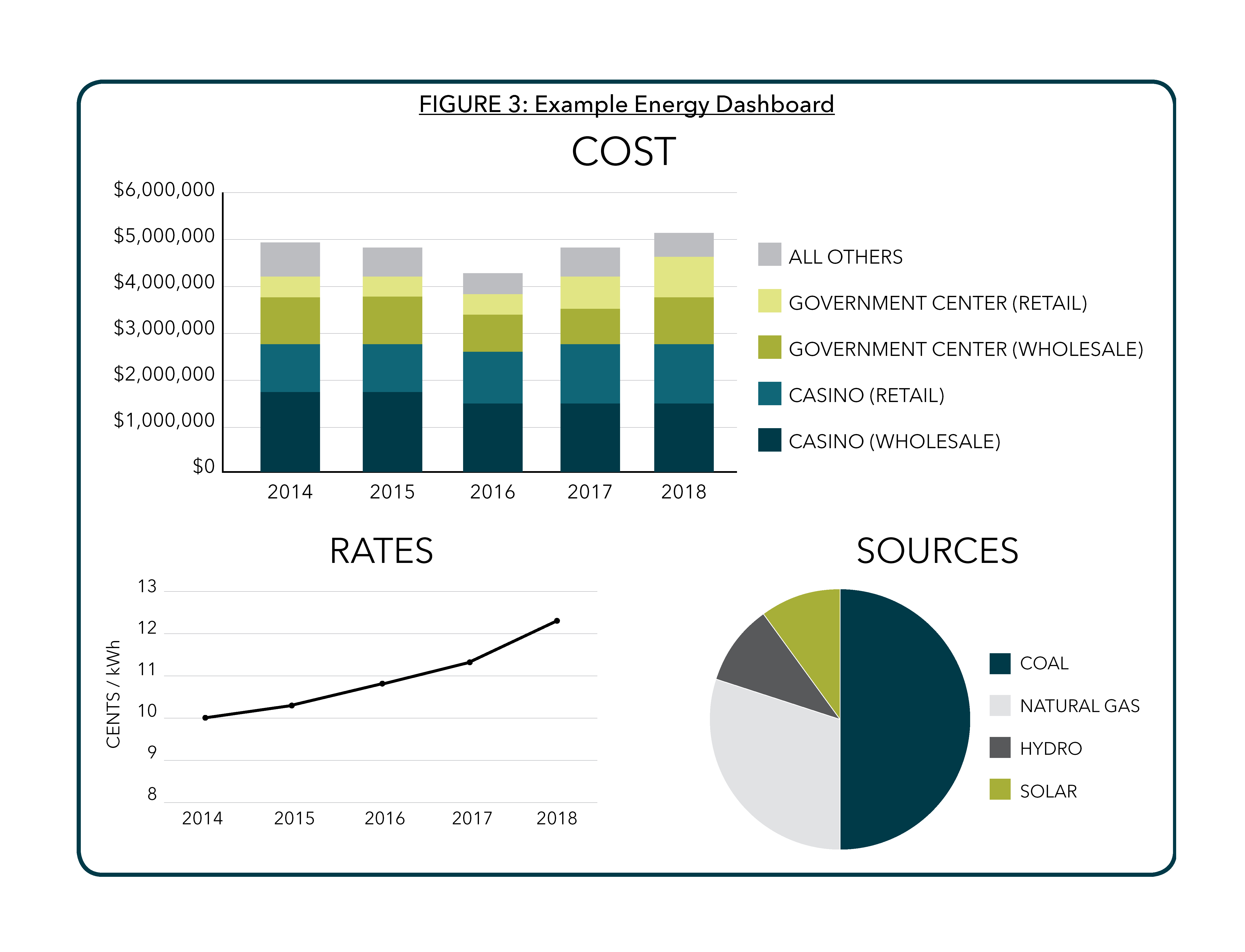 To assess the long-term value of an energy investment, the Tribe should have a clear understanding of its current energy landscape. This includes an understanding of how much energy the Tribe uses, where it is sourced from, and how much that energy costs. Tribes can consider maintaining a simple energy dashboard that can be quickly understood by a broad audience across Tribal departments. An example is shown in Figure 3.